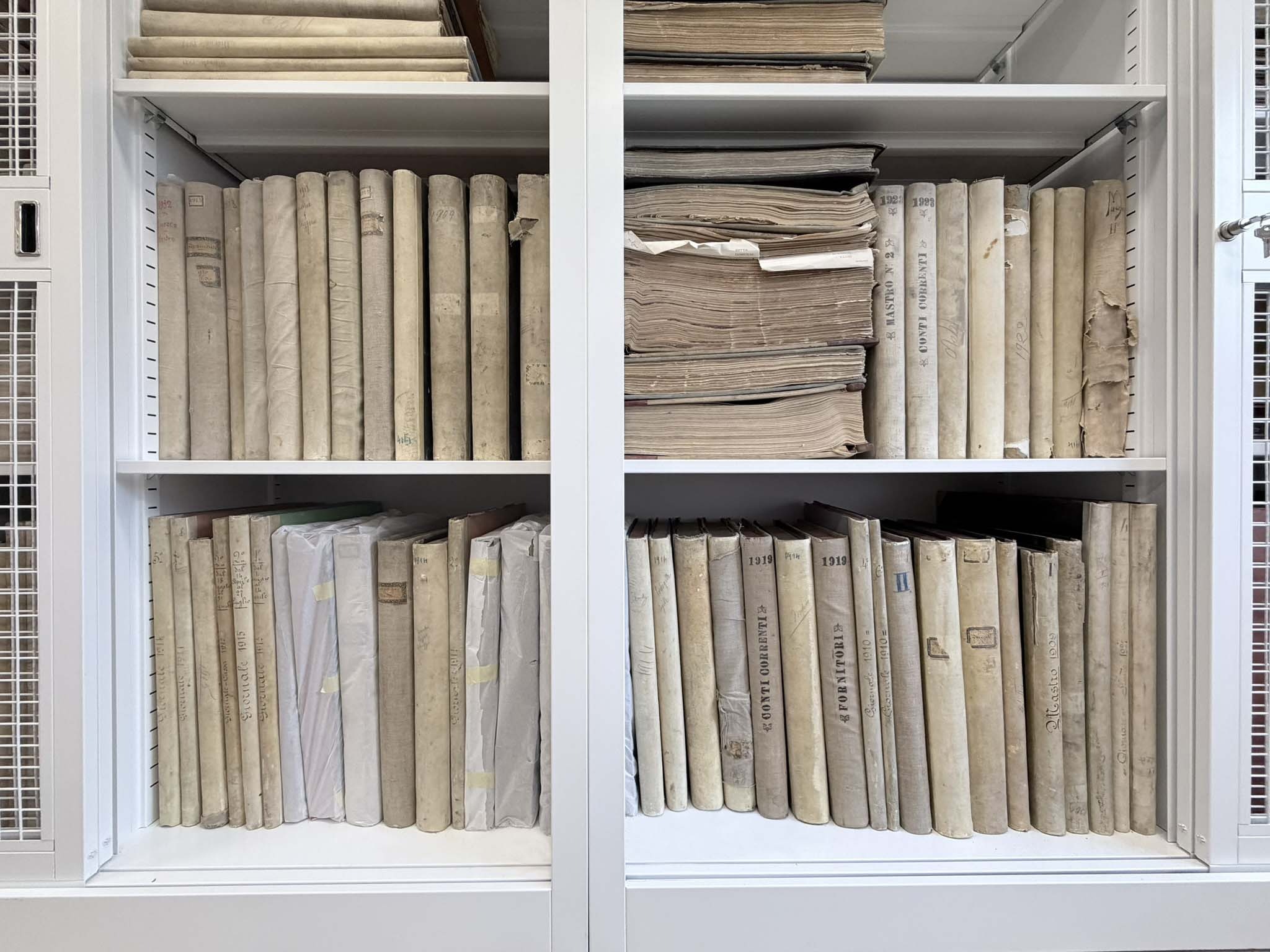Il fondo, composto da circa 1.100 unità tra registri copialettere e contabili databili dal 1903 al 1955, si presentava in condizioni critiche a causa di una grave contaminazione microbiologica e della conservazione in ambienti non idonei. Dopo la messa in sicurezza, il materiale è stato trasferito nelle nuove scaffalature predisposte presso la Fondazione.