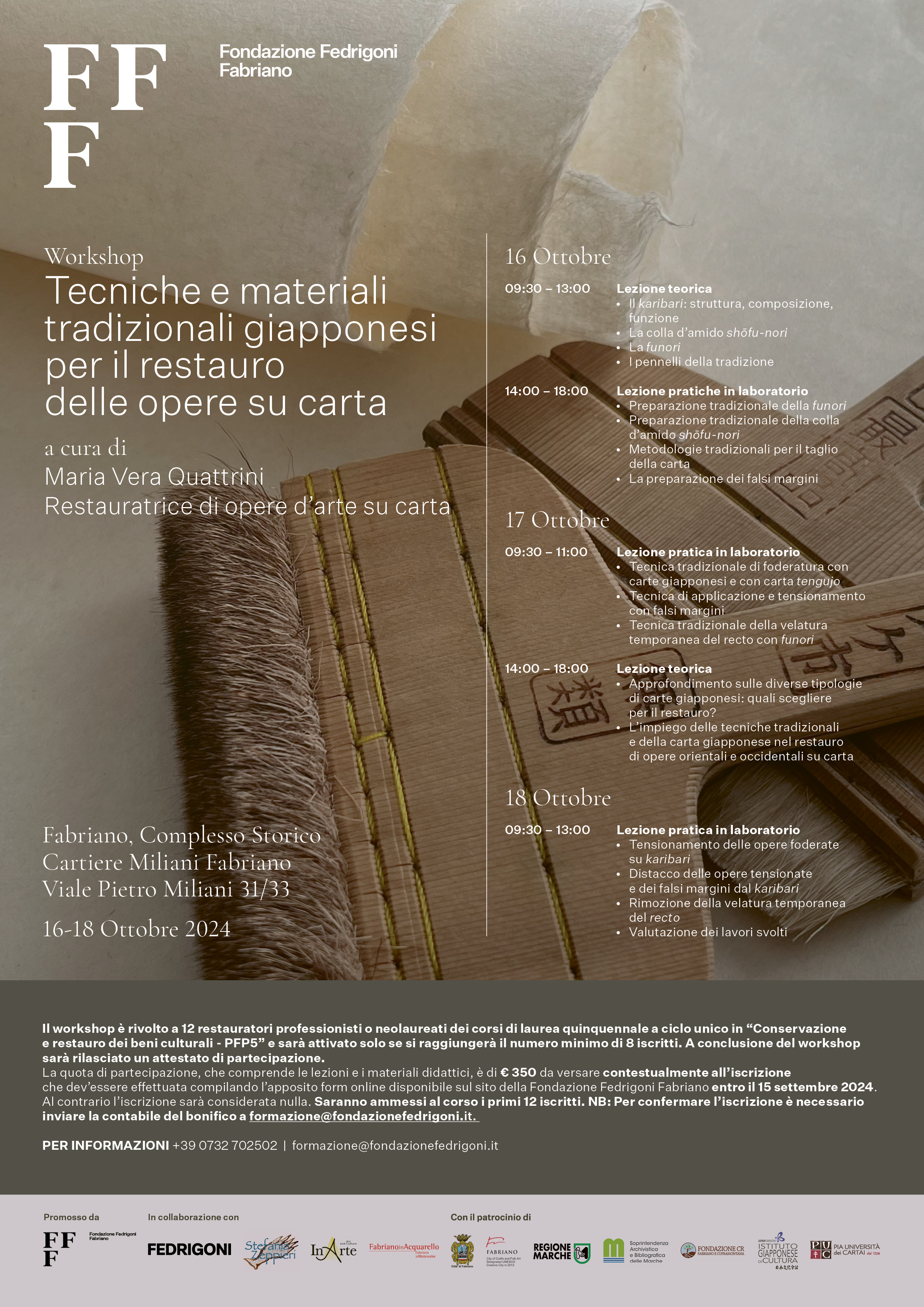 * The workshop, promoted by Fondazione Fedrigoni Fabriano, in collaboration with Fedrigoni, Stefania Zeppieri (Restauratrice di beni librari e archivistici e opere d’arte su carta) e Fabriano In Acquarello has obtained the patronage of Comune di Fabriano, Regione Marche, Fondazione Carifac, Istituto Giapponese di Cultura, Pia Università dei Cartai and the support of Soprintendenza dei Beni archivistici e librari delle Marche.